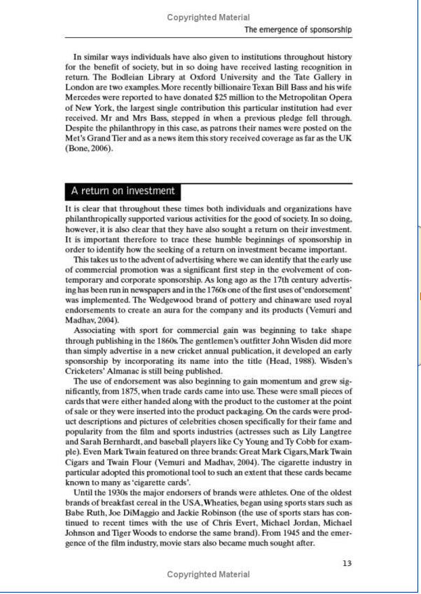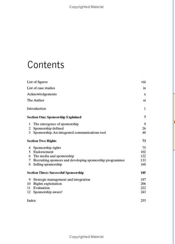 Wichtigkeit des persönlichen Kontaktes, Vorschlag proposal in electronically form (man muss nicht unbedingt einen Folder vorlegen), initial proposal - create interest (jedoch schon in Ansätzen auf die Bedürfnisse des zukünftigen Sponsors ausgerichtet), draft sponsorship solution (presenting rights without price), Sponsorship solution (presenting rights, which can be valued easily). Preis: Kosten, Sponsoring in kind (Naturalien), Marktwissen, Wert für den Sponsor, Medienäquivalenz (Angebotene fixe exklusive Werbemöglichkeiten). Präsentation: allgemeine Richtlinien ab S. 171, Contracting