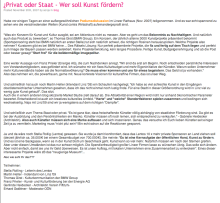 "Was ein Konzern für Kunst und Kultur ausgibt, sei am Aktienkurs nicht zu messen. Aber es geht um das Bekenntnis zu Nachhaltigem. Und natürlich auch das Produkt zu bewerben", so Thomas Girst (BMW Group). Ein Konzern, der jährlich alleine 3000 Kunstprojekte präsentiert bekommt (Sportsponsoring steht bei BMW natürlich an erster Stelle) tut sich natürlich schwer, die richtigen Rosinen herauszupicken. Welche Projekte also nehmen? Kuratoren gibt es bei BMW keine ... Des Rätsels Lösung: Nur perfekt präsentierte Projekte, die fix und fertig auf dem Tisch liegen und perfekt zum Image der Bayern passen werden selektiert. Keine Projektentwicklung, kein langes Prozedere. Fertige Kunst, Budgetgenehmigung und ab die Post oder besser gesagt "Start frei" für die bolidenmäßige Imagepolitur.