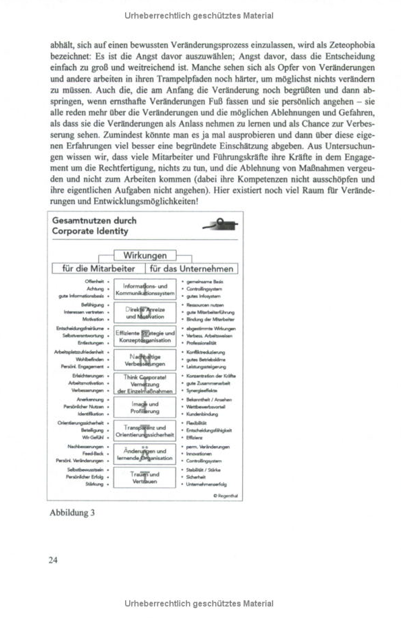 Gesamtnutzen durch CI - Grafik S. 24 | Erfolge durch CI fürs Unternehmen - Grafik S.27 (Mitarbeiter, Kunden - Vertrauen, Glaubwürdigkeit, Miteinander) | CI - Fremdbild Selbstbild Arbeitsweisen- Grafik S. 28 | Bereiche des CI - Grafik S.30