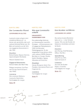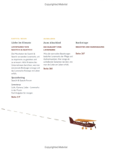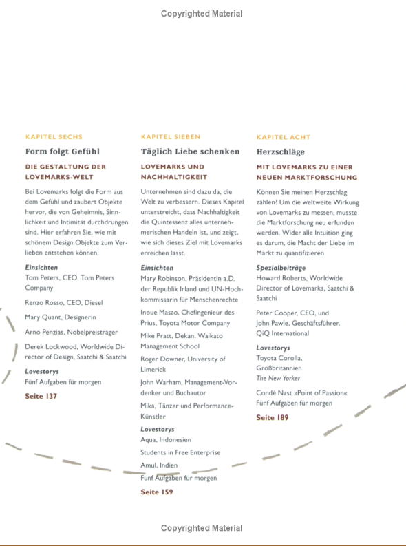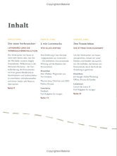 5 Aufgaben für Morgen: S. 30 | die neue Welt der Verbraucher - Attention versus Attraction S. 34, Mafo-Splitter S.48, Überzeugungsarbeit S. 70, Kundenkontakt S. 112, Fantasien für Shops S. 136, Bewertung von Design und CD S. 158, Nachhaltigkeit S. 188, Bewertung von Emotionen und Vernunft in der Marke S. 214, Persönliches S. 262